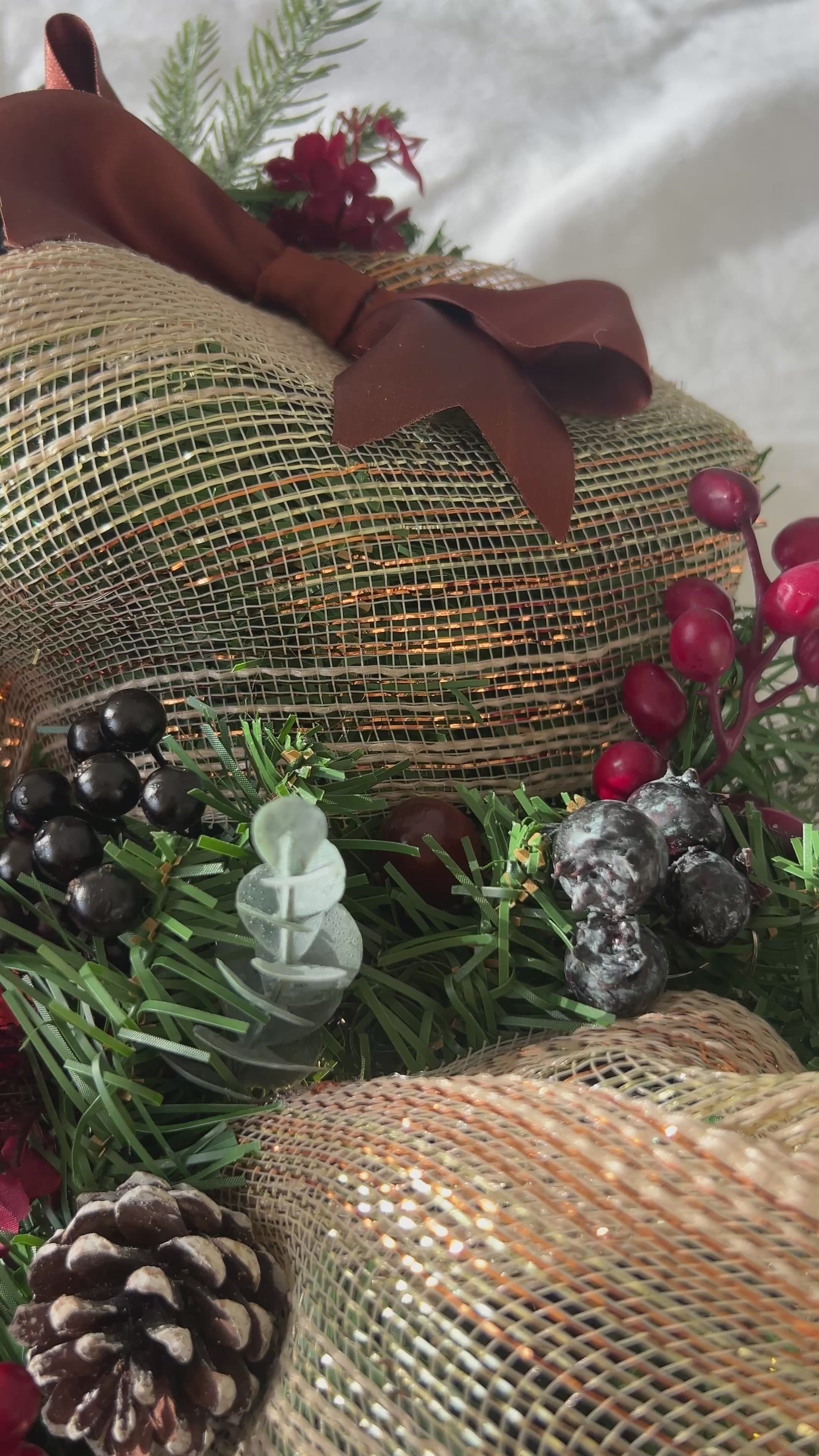 Timeless luxury. This wreath is pre-lit with warm white battery operated lights, and features a premium artificial evergreen, accented with clusters of mixed berries, frosted pinecones, and delicate foliage for a realistic, lasting design.